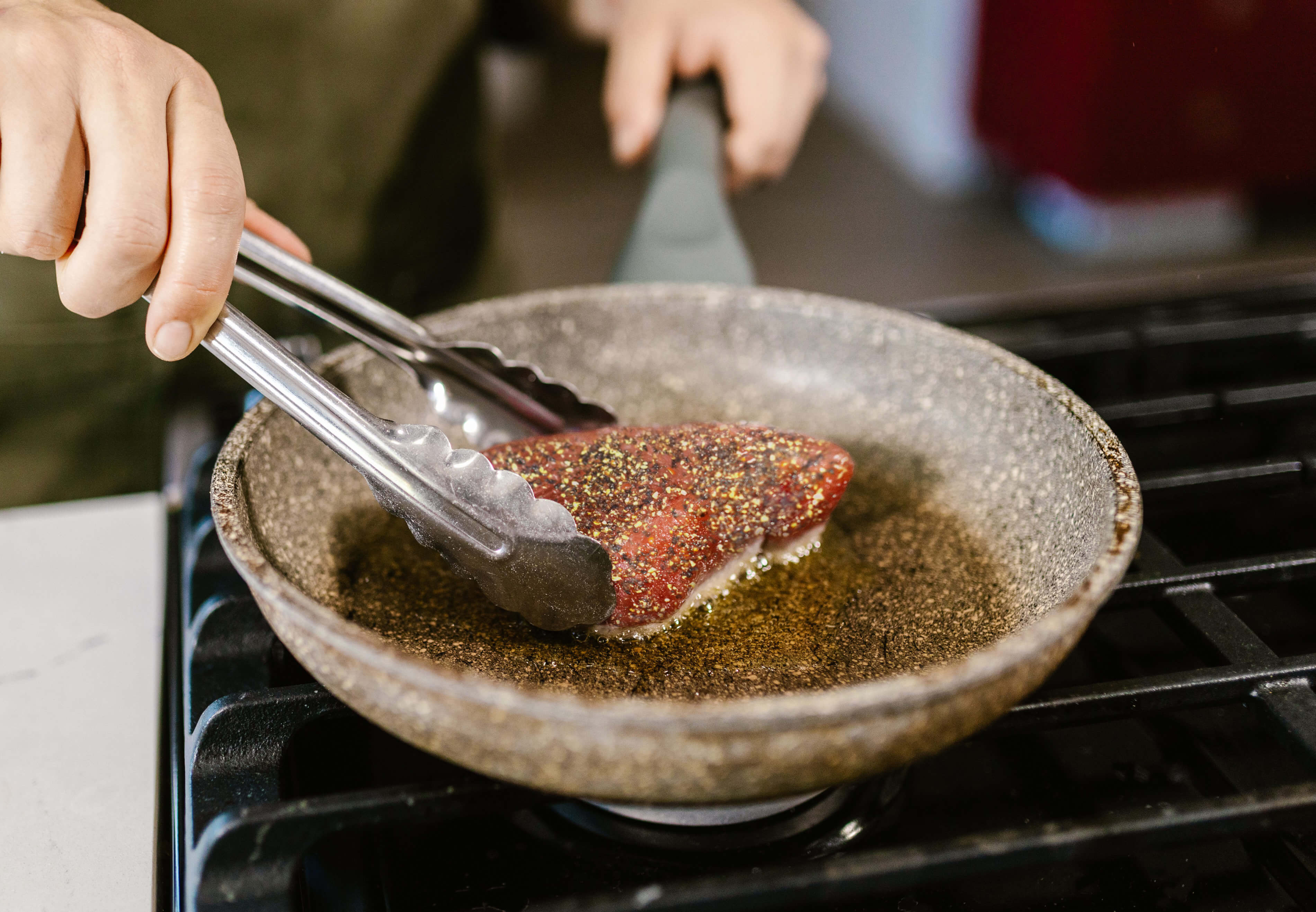 Crush the red pepper blend and spread on a plate or cutting board. Press the tuna steaks into the crushed pepper, turning to coat both sides. Sprinkle steaks with salt.