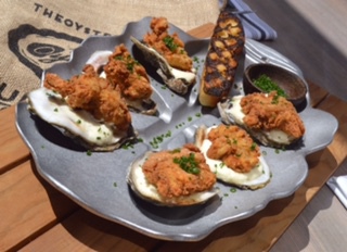 Lay each oyster shell in a platter, place ½ to 1 oz of heart of palm cream on shell and place fried oyster on top, garnish with chives and serve immediately.