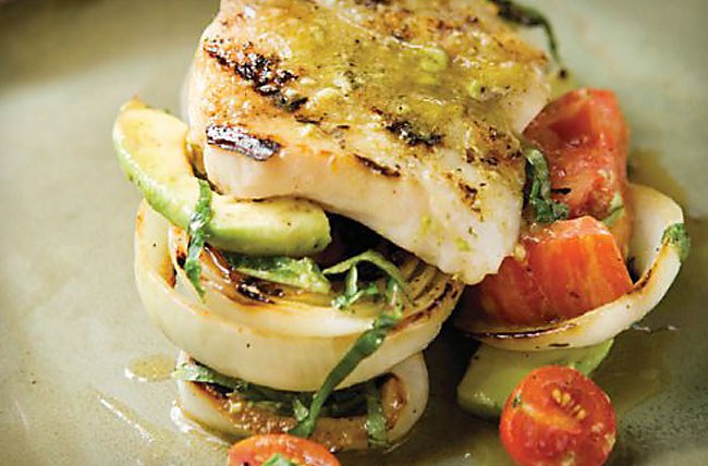 Arrange 1 marinated tomato slice in the center of each of 6 dinner plates. Using a slotted spoon, place onion and avocado slices on top of the tomatoes. Top each salad with a second marinated tomato slice. Spoon several tablespoons of the vinaigrette over and around each salad. Arrange the grilled grouper filets on top of each salad. Toss the arugula in the mixing bowl with the remaining vinaigrette. Top each fish filet with a small mound of the arugula. Serve immediately.