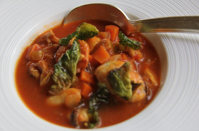 2. Heat remaining 1/2 cup extra virgin olive oil, 8 tablespoons butter and garlic in a large, heavy skillet over high heat until fragrant, 1–2 minutes. Working in 2 batches, dredge snapper, oysters and large rock shrimp in flour, shaking off excess, and fry, turning seafood frequently until golden, 1–2 minutes. Transfer seafood with a slotted spoon to pot with sauce and add crabmeat, cover and simmer for 10–15 minutes.