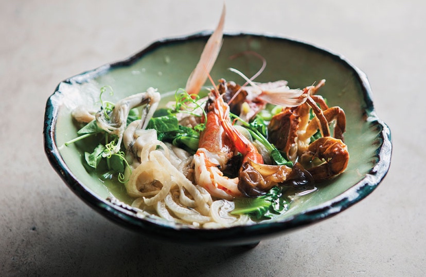 Bring clarified pork stock to a simmer. Add Blue Crabs, ginger, garlic, and roe. Cover and let simmer for 5 min. Remove lid, add jowls, shrimp, lily flowers, wood ear mushrooms, pig skin noodles, and tatsoi. Let simmer for another 3 mins.