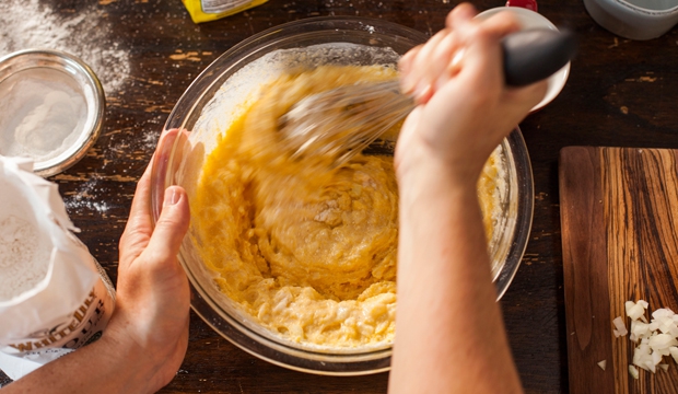 Find a nice, big bowl and start by mixing all of the dry ingredients together. (We recommend yellow cornmeal, but white cornmeal is perfectly all right.) Once the dry ingredients are mixed thoroughly, whisk the buttermilk and eggs together in a separate bowl and then combine all of the ingredients. Make sure you’ve mixed it well.