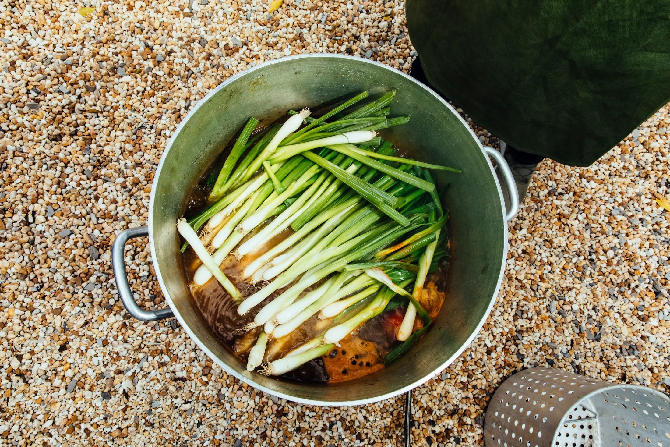 Large industrial boiling pots with fitted handled strainers can be found as “Boiling Kits” online and in many Hardware stores and grocery stores in the Southeast. 24-42 quart should accommodate a boil of this size. If fitting your boiling pot over a gas jet burner and stand, be sure to set up a distance away from your party and home and take proper precautions.